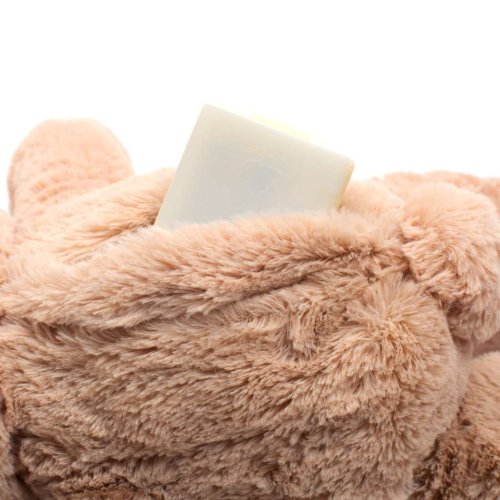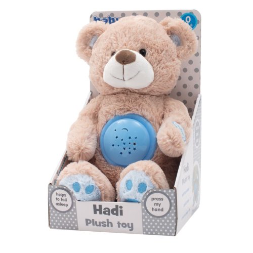 Roztomilý plyšový medvedík s projektorom Baby Mix. Po stlačení tlačidla umiestneného na labke zapnete svetielko ktoré mení farbu a poslúži ako maličká nočná lampička a zároveň sa spustia jemné melódie. V zadnej časti je umiestnený strojček na batérie. Zapnúť a vypnúť je možné tlačidlom on/off. Batérie sú súčasťou balenia. 3x Typ AA 1,5 V. Hračka je vhodná pre deti od 6 mesiacov. Rozmery: cca 34 cm.