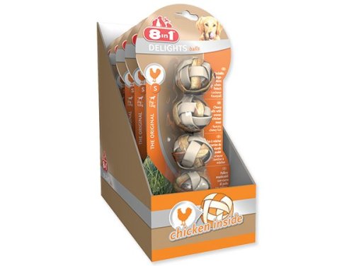 Žuvacie gule so sušeným kuracím mäsom vo vnútri, doplnkové krmivo pre dospelé psy od 2 do 27 kg hmotnosti.