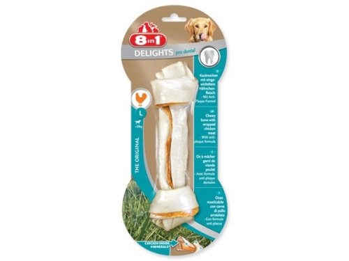 Žuvacia kosť s mineráliami a so sušeným kuracím mäsom vo vnútri, doplnkové krmivo pre dospelé psy od 20 do 40 kg hmotnosti.