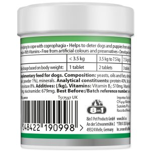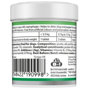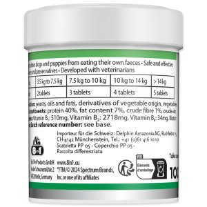 Tablety 8v1 Deter sú ideálnym denným doplnkom pre psov, ktorý pomáha zabrániť a odradiť ich od konzumácie vlastných výkalov (koprofágia). konzervantov. Produkt je vyrobený v Nemecku.