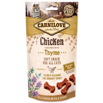 Polomäkké a chrumkavé maškrty pre mačky Carnilove Snack s mäsom z kurčaťa. Lahodné maškrty Chicken with Thyme (kurča s tymiánom) sú vhodné pre všetky mačky. V zložení nie sú obsiahnuté žiadne obilniny a ani umelé farbivá. Tymian podporuje zdravie močových ciest.
