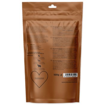 Mrkva 14,95%, tekvica 12,95%, sušené jablká 14,95%, datle 14,95%, arašidové maslo 9,95%, jablčné pyré 9,95%, ovsené vločky 9,95%, ľanová múka 5%, r 0,5%, škorica 0,5%, CBD 100 mg, vitamín E (tokoferol) 2,0%, benzoát sodný.