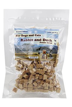 Mäsová pochúťka pre psy a mačky, králičie a kačacie mäso kocky sušené mrazom.
