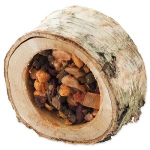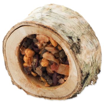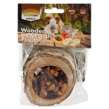 Miska z dreva listnatých stromov je naplnená ovocnou zmesou. Váš maznáčik sa pri vykusovaní náplne zabaví a zároveň okus dreva pomáha prirodzenej starostlivosti o zuby. Prázdnu misku môžete potom znova naplniť obľúbeným krmivom vášho zvieraťa.