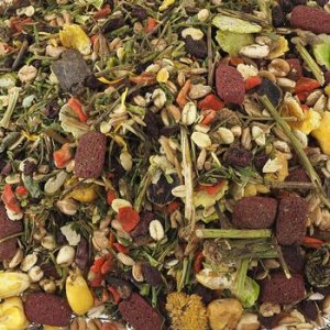 Zloženie: sušená červená repa 11%, pšeničné vločky 10%, ovsené vločky 10%, hrachové vlocky 9,5%, sušená mrkva 8%, sušená petržlen 6%, kukuričné pukancie 5%, pšeničné pukancie 5%, sušená pšenica 5 %, extrudovaná kukuričná múka 4 %, karob 3 %, kukuričné vločky 3 %, sušená medovka 3 %, sušená púpava 3 %, sušená echinacea 2,8 %, sušená mäta pieporná 2 %, ryžové puk 1,2%, sušené kvety nechtíka lekárskeho 1%, sušené kvety červeného ďateliny 0,5%.