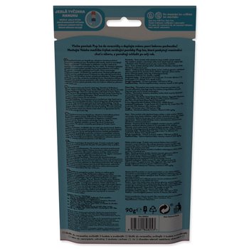 | Upozornenie | Výrobok môže obsahovať stopy arašidov a iných orechov. Uchovávajte vrecká mimo dosahu dojčiat, malých detí a domácich zvierat. Maškrta iba pre psy. Výrobok obsahuje vrecko s deoxidačným účinkom, ktoré nie je určené na konzumáciu. |