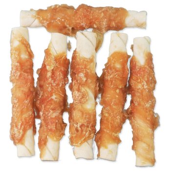 Tyčinky z byvolej kože obalené kuracím mäsom pre stredné a veľké psy. Doplnkové krmivo, podávajte ako pochúťku.