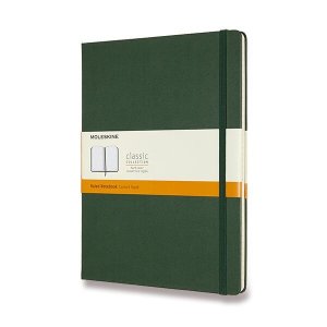 Zápisník s pevnou, v chrbte šitou väzbou v kartónových doskách, obopnutý pružnou páskou proti samovoľnému otváraniu.