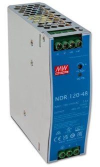 Priemyselný napájací zdroj, nastaviteľné výstupné napätie 48-55 V, výstupný prúd 2,5 A, výkon až 120 W, montáž na DIN lištu, účinnosť 89 %.