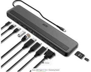 Acer 13in1 Type C Minidock: 3x USB3.0 (5Gb/s Data Transfer), 1x USB-C (5Gb/s Data transfer), 1x USB-C Power Delivery (100W), 1x SD/TF karta slot, 2x HDMI (až 3840x2160P) @60Hz), 1x Display Port (až …