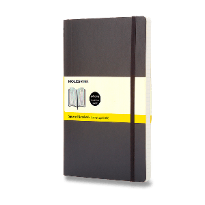 Zápisník s mäkkou, v chrbte šitou väzbou v kartónových doskách, obopnutý pružnou páskou proti samovoľnému otváraniu.
