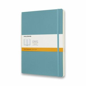Zápisník s mäkkou, v chrbte šitou väzbou v kartónových doskách, obopnutý pružnou páskou proti samovoľnému otváraniu.