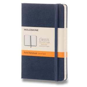 Zápisník s mäkkou, v chrbte šitou väzbou v kartónových doskách, obopnutý pružnou páskou proti samovoľnému otváraniu.
