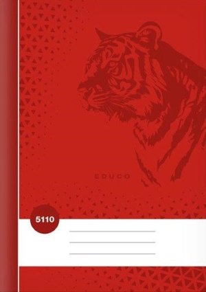 Školský zošit vo formáte A5, štvorčekový, v červenej farbe, s motívom tigra, v doskách z kriedového papiera.