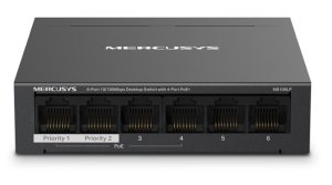 PoE+ Switch Mercusys MS106LP 6Port 100 MbpsPoE Switch 6× 10/100 Mbps RJ45 portov so 4 portami PoE+ Podpora výkonu PoE až 30 W pre každý port PoE (max. 40 W) 2× Uplink porty pri zapnutí režimu izol.