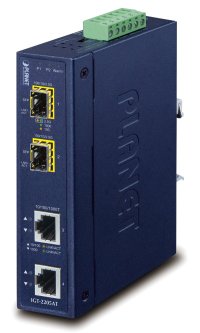 PLANET IGT-2205AT; Priemyselný konvertor Ethernet RJ-45 10/100/1000 Base-T na optiku 100/1G/2.5G Base-X so slotmi SPF pre inštaláciu opt. modulov (série MFB a MGB).