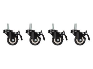 Sada koliesok pre rozmerné a ťažké stojanové racky, obsahuje 2 ťažkotonážne kolieska s brzdou a 2 bez brzdy, 16 skrutiek M5 x 12 s hlavou Thorx a 16 veľkoplošných podložiek.