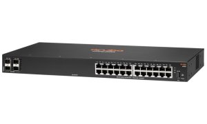 HPE Aruba 6000 24G 4SFP; Spravovateľný switch ponúkajúci 24× 10/100/1000 Mbps RJ-45 portov a 4× 1GbE SFP sloty.