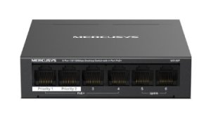 TP-Link TL-SG105PE; Switch ponúkajúci päť GbE RJ-45 portov s podporou 4 x PoE+ (802.3 af/at) a celkovým napájacím výkonom až 65 W .