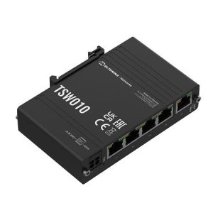 Teltonika TSW010; Priemyselný switch bez manažmentu ponúkajúci päť RJ-45 portov (10/100 Mbps).