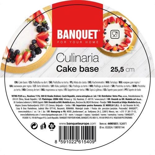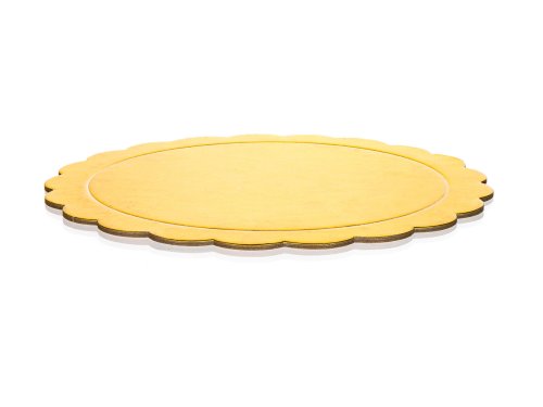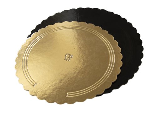 Okrúhla podložka na tortu CULINARIA. Podložka je vyrobená z niekoľkovrstvového 3 mm hrubého kartónu. Z oboch strán je potiahnutá zlatou fóliou, ktorá zaručuje vodeodolnosť a nepremastiteľnosť. Podložka pod torty je ideálna pracovná tácka, využijete ju pri práci s tortou, finálnom dozdobení a tiež na prenášanie torty.