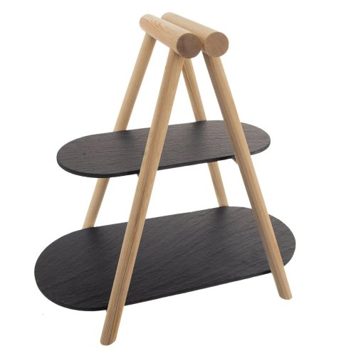 Štýlový servírovací stojan bude skvelý na servírovanie raňajok i desiaty, sladkých dezertov ku káve, slaných dobrôt alebo syrov k vínu, skvele ho využijete na oslavách, svadbe. Dvojposchodový. Materiál bridlice, borovicové drevo, povrázok. Rozmery: dĺžka 31 a 41 cm, šírka 13.5 a 18.5 cm, výška 39 cm, celková šírka 24 cm. Nie je vhodný do umývačky. Balenie v darčekovej krabici. EAN 8592381180676