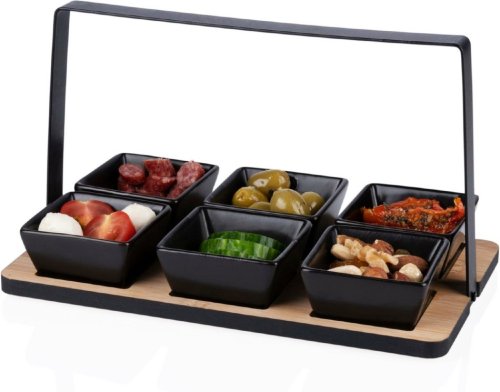 • Šesť keramických misiek – Štvorcový dizajn umožňuje prehľadné servírovanie rôznych pochúťok.