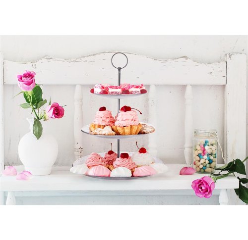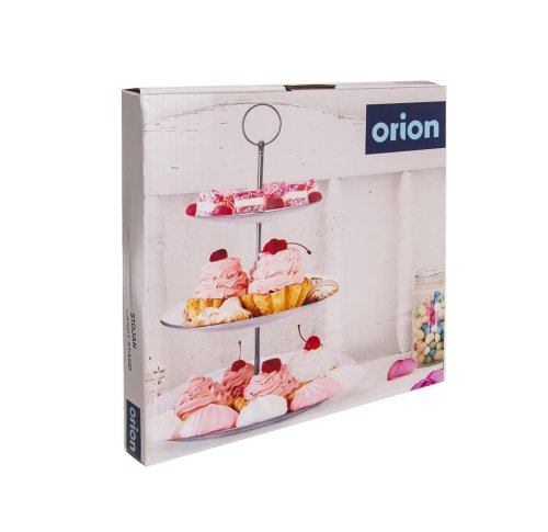 Stojan 3 poschodový guľatý na servírovanie zákuskov, cukroviniek, ovocia, jednohubiek, chlebíčkov atď. Materiál sklo a kov. Priemer 15/20/25 cm a výška 33 cm. EAN 8592381162849