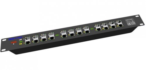 Panel do 19" racku integrujúci 12 gigabitových tienených pasívnych POE injektorov s napájacím rozsahom 24 - 57V.
