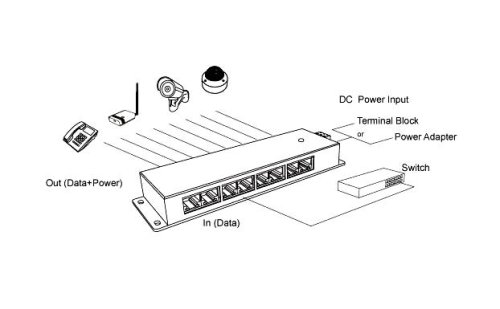 Technické špecifikácie: Input: 18-57V (2.1 power jack) Dáta: 1/2 & 3/6 & 4/5 & 7/8 Power: podľa zvoleného režimu A / B Standards: passive PoE, 802.3af / 802.3at Ethernet: TIA/EIA 568 Cat5E, Cat6E Data rate: 10/100/1000Mbps Connectors: 6x shielded GB RJ-45 Operating Temperature: 0°C ~ 40°C Storage Temperature: -40°C ~ +70°C Operating Humidity: 10% ~ 80% RH Storage Humidity: 5% ~ 90% RH Certifications: CE