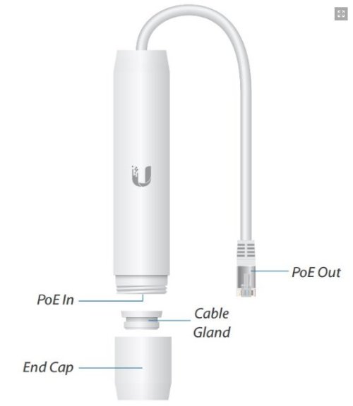 Vonkajší PoE extraktor pre napájanie väčšiny RouterBOARDov alebo zariadení od Ubiquiti s gigabitovým portom. Jedná sa o prevodník z aktívneho napájania označeného ako 802.3af na pasívne PoE 24V/0,5A s maximálnou záťažou 12W.