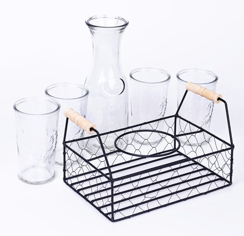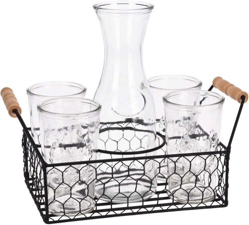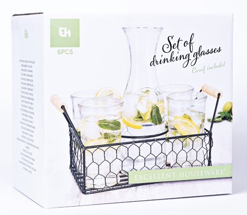 - štýlové dekorované poháre s veľkou karafou v praktickom košíku- materiál: hrubostenné sklo- hrdlo karafy aj pohárov je dostatočne široké, bez problému do nich možno naliať aj ovocie či ľad- celá sada …