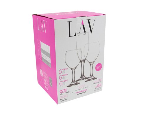 Sada obsahuje 6 pohárov na sekt, a 12 pohárov na víno v dvoch veľkostiach.