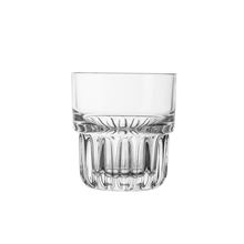Stohovateľný, tvarovaný transparentný pohár na nápoje, ktorý vďaka svojmu tvaru šetrí miesto pri uložení