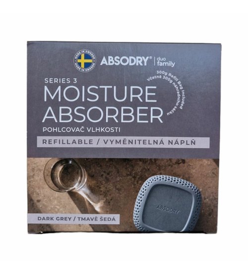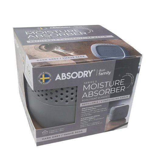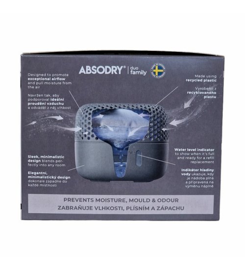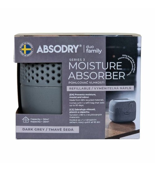 • pohlcovač vlhkosti Absodry Duo Family je navrhnutý pre priestory o rozmere až 30m3