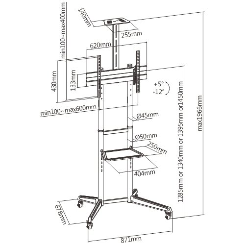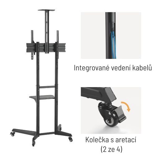 Hlavné vlastnosti: • Montáž doska pre upevnenie TV je nastaviteľná v štyroch výškových úrovniach – 1285, 1340, 1395 alebo 1450 mm • Výškovo nastaviteľná polica s nosnosťou až 5 kg poskytuje dostatok úložného priestoru pre príslušenstvo • Výškovo nastaviteľná polica s nosnosťou až 5 kg +5°~-12° bez použitia nástrojov • 4 kolieska umožňujú jednoduché a bezpečné premiestnenie stojana podľa potreby, 2 kolieska s možnosťou aretácie • Vnútorné vedenie káblov rámom stojana pre ich jednoduchú organizáciu a usporiadanie • Podporované rozstupy VESA: 100x100,200x100,200x200,300x200,400x200,300x300,400x300,400x400,600x400 • Jednoduchá a rýchla montáž