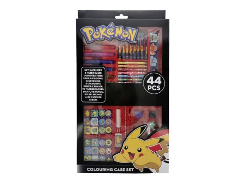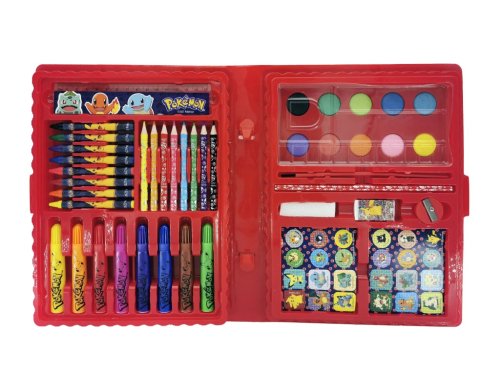 Pokémon set na kreslenie s motívom Pokémonov. Balenie obsahuje 8ks farebných fixiek, 8ks voskoviek, farebné pastelky, strúhadlo, gumu, pravítko, set vodoviek so štetcom, ceruzku HB a dva sety samolepiek.