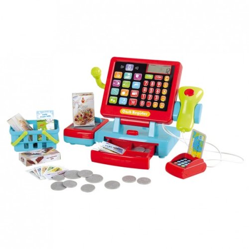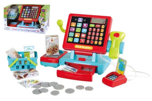 Deti si môžu zahrať na obchod s pokladňou, ktorá reaguje na dotyk. Balenie obsahuje mnoho doplnkov, ktoré do obchodu patria.