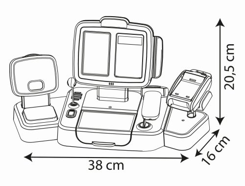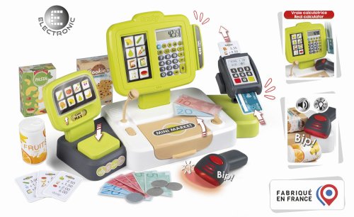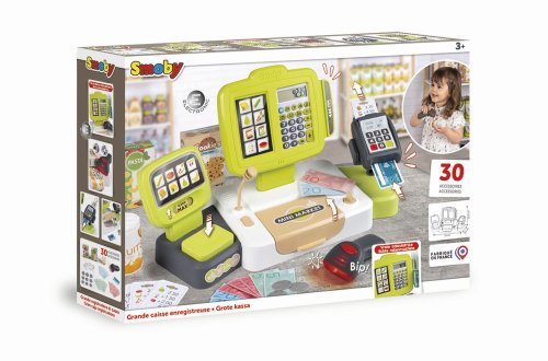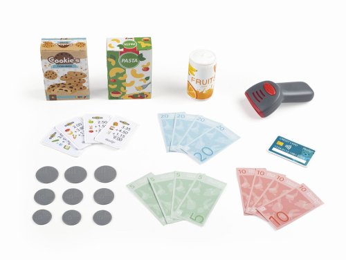 Elektronická pokladňa s funkciou skutočnej kalkulačky, skener so svetelnou a zvukovou funkciou, čítačka kreditných kariet s účtenkou, mechanická váha, makety potravín, mikrofón a ďalšie. Rozmery: 39 x 21,5 x 16 cm.