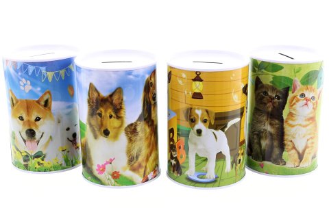 Plechová pokladnička s motívom psov a mačiek o veľkosti cca 13,5 x 9 cm. Pokladnička nemá otváranie. 4 druhy – dodávame podľa skladovej dostupnosti. Vek 3+