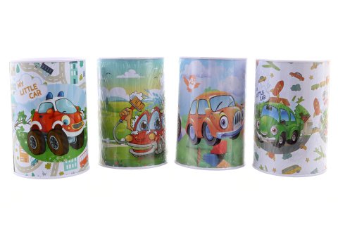 Kovová pokladnička s motívom veselých autíčok. Rozmer pokladničky cca 13x9 cm. 4 druhy - dodávame podľa skladovej dostupnosti. Vek 3+