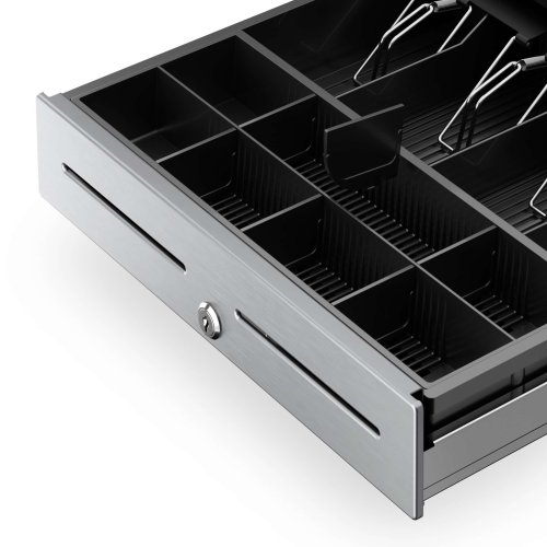 Pokladničná zásuvka Star Micronics CD4-1616BKSS48-S2 s nerezovým dizajnom čela je určená pre pokladničné tlačiarne. Je vybavená zásuvkou na 4 druhy bankoviek a 8 typov mincí . Zásuvka má zosilnenú hornú časť, ktorá jej zaisťuje väčšiu pevnosť.