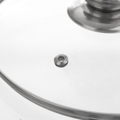 Sklenená pokrievka s nerezovým úchytom a otvorom na únik prebytočnej pary .