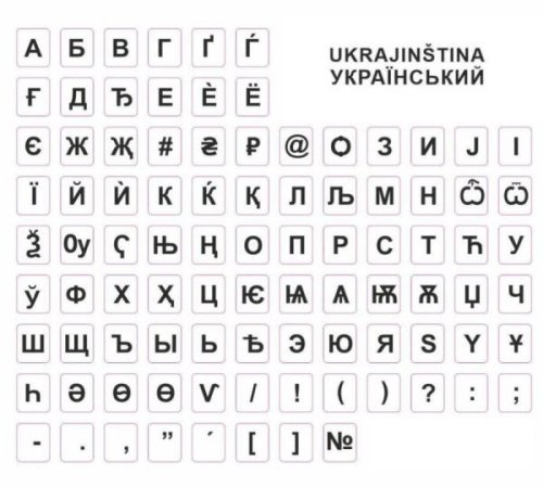 *Biela farba písma a priehľadné pozadie prelepov *Prelepka vhodná na nalepenie na tmavú klávesnicu s bielym písmom *Azbuka s kompletnou sadou znakov používanou na Ukrajine *Jednotlivé prelepky veľkosť 6 x 7 mm *Kompletný aršík má veľkosť 10 x 9 cm *Prelepky je možné aj na kraj klávesov *Kompletné pretlače, vhodné aj pre notebooky
