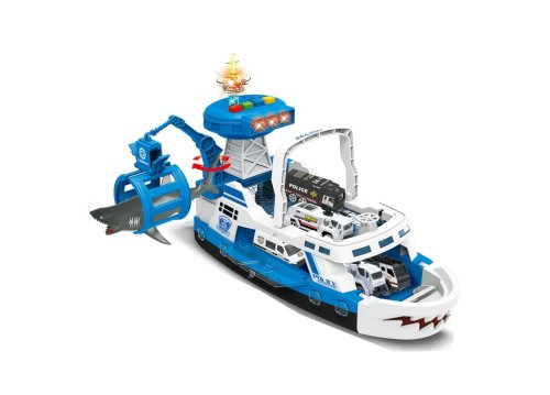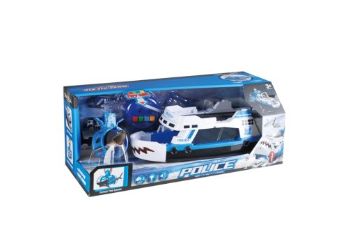 Hrací set chyť žraloka má otvárací predok, autíčko na pull back, rampa pre zjazd/nájazd, rotačnú časť u klietky pre žraloka, otváracia, kabína. Zvuky policajného auta, ambulancie, streľby a motora. Loď je ľahko prenosná vďaka svojej rukoväti.