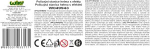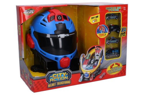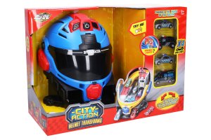 Policajná stanica helma. Rozmery 20x32x20 cm. Vydáva svetelné a zvukové efekty. Aktivácia tlačidlom na helme. 3xAG13 batérie súčasťou. Súčasťou 4 kovové autá 6,5 cm s voľnými kolesami, výťah.