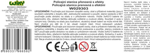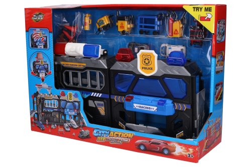 Policajná stanica prenosná. Rozmery 56x18x23 cm. Svetelné a zvukové efekty. Aktivácia tlačidlom na modrom paneli. 3xAG13 batérie súčasťou. Súčasťou 2 autá s voľnými kolesami, mnoho príslušenstva (dopravné značky, hasičský prístroj, umývačka, čerpacie stanice, diagnostika a ďalšie).