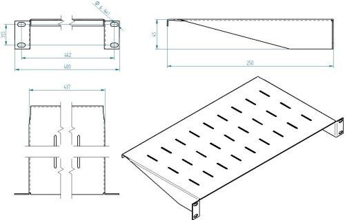 Pevná perforovaná polica Masterlan FS-A1-250-B s predným 2-bodovým uchytením je určená na dátové a telekomunikačné účely všetkého druhu, kedy slúži na umiestnenie do 19″ rozvádzačov bez príslušného rámu . Polica zaberie výšku 1U , jej hĺbka činí 250 mm a maximálna nosnosť plata zodpovedá 25 kg , takže sa hodí najmä pre miniatúrne servery s kompaktnými rozmermi a nízkou hmotnosťou.