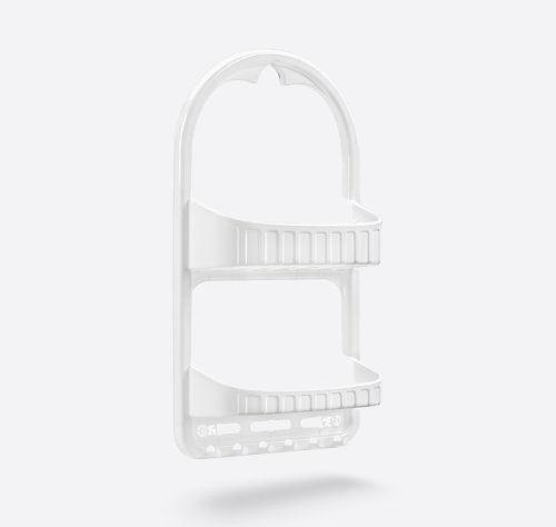 Dvojposchodová plastová polica s háčikmi na zavesenie, určená na montáž na stenu alebo pomocou prísaviek. Rozmery 27 x 12 x 50 cm (Š x H x V). EAN