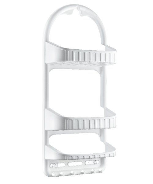 Trojposchodová plastová polica s háčikmi na zavesenie, určená na montáž na stenu. Rozmery 27 x 12 x 62 cm (Š x H x V). EAN 8696287091651